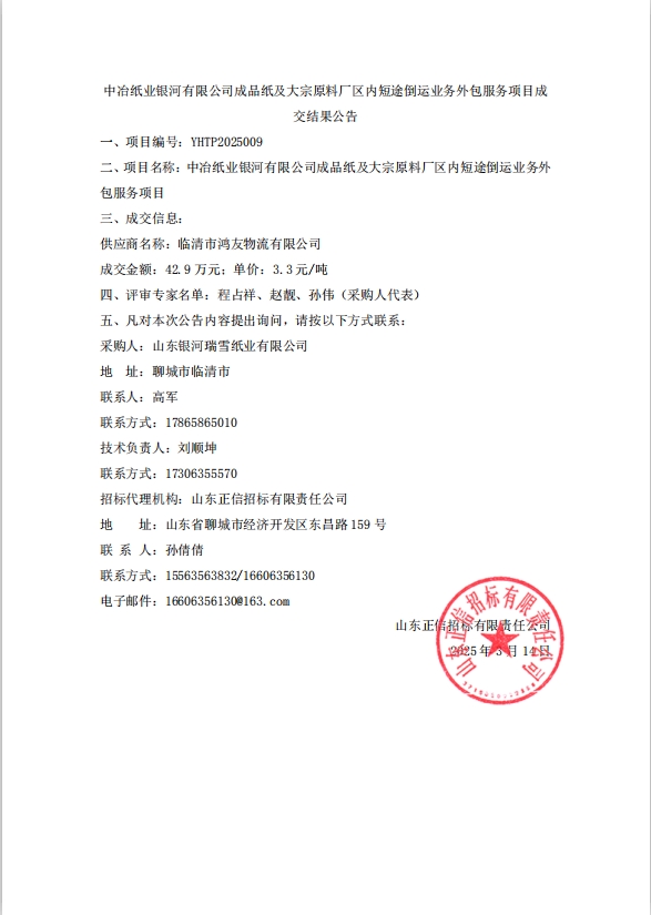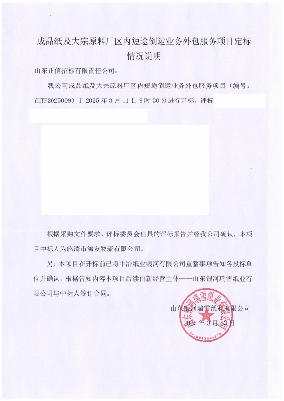 中冶紙業(yè)銀河有限公司成品紙及大宗原料廠區(qū)內(nèi)短途倒運(yùn)業(yè)務(wù)外包服務(wù)項(xiàng)目成 交結(jié)果公告