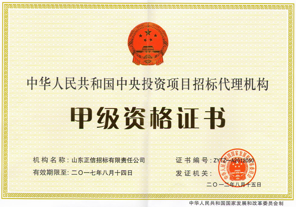 中央投資項目招標(biāo)代理機(jī)構(gòu)甲級資格證書